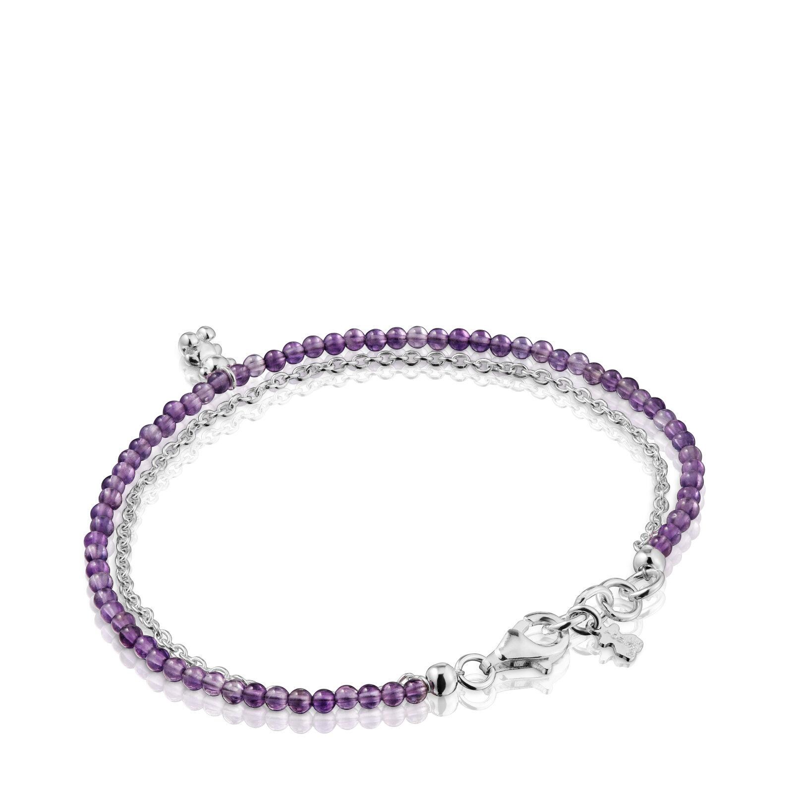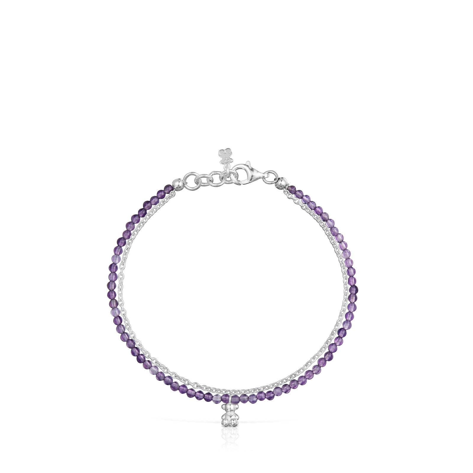 - Pulsera TOUS Bold Bear de plata de primera ley y amatista formada por dos cadenas unidas en los extremos. Una cadena es de plata y la otra de gemas con motivo oso colgante de plata. Tamaño gemas: 2-2,5 mm. Tamaño oso: 5,35 mm. Longitud pulsera: 17,5 cm. Cierre mosquetón.