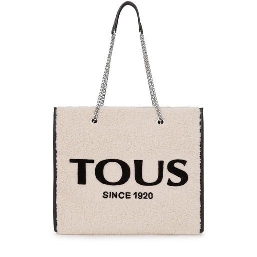 Large TOUS Amaya Warm shopping bag in beige-colored faux fur. A chain incorporated into the long shoulder straps gives the piece a touch of sophistication. It fastens with a magnetic button. It comes with an open interior pocket and another with zipper fastening. This fantastic soft handbag will become your perfect accessory this winter. Measurements (height x width x depth): 34 x 40 x 17 cm.