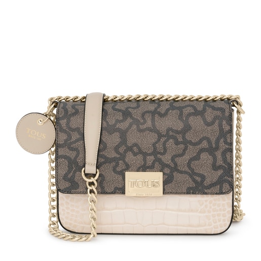 Medium Tous shoulder bag from the Kaos Legacy collection in cowhide leather on its beige base, mixed with vinyl printed with bears in beige and gray. Flap and snap button closure. Long chain-type shoulder strap, adjustable and non-removable. Bag has a flat interior pocket. Measurements: 8 x 24 x 20 cm.