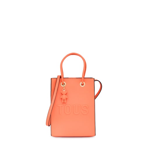TOUS La Rue Pop minibag in orange synthetic leather. Magnetic button closure. Fixed handles and adjustable and detachable crossbody strap. Features a pretty bear pendant detail. Measurements (height x width x depth): 20 x 16 x 6 cm.