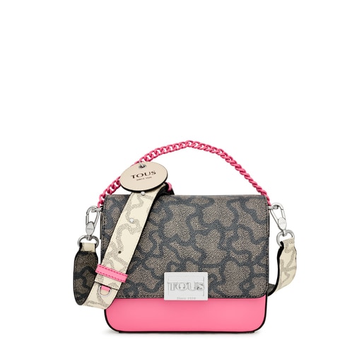 Small TOUS Kaos Legacy crossbody bag in canvas with a black and beige Kaos print. It also features trim in pink colored cowhide leather. Featuring a flap and a push closure. The handle is made from a metal chain and it includes an adjustable and detachable crossbody strap. It comes with an open interior pocket for cards. Measurements (height x width x depth): 16 x 19 x 6 cm.