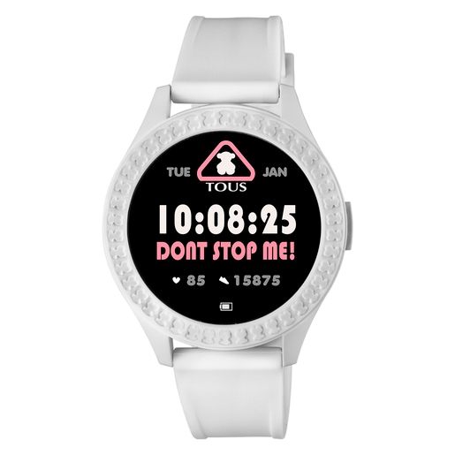 Montre Smarteen avec biseau décoré d’oursons en relief et bracelet en silicone. Compatible avec Android 4.4, iOS 8.0 et version ultérieure. Bluetooth BLE 5.0. Mémoire RAM : SRAM M4. Batterie rechargeable avec câble magnétique. Autonomie : 5 jours en fonctionnement et 10 en veille. Fonctions : 8 cadrans TOUS, avec un cadran interchangeable depuis l’application TOUS WEAR, heures, minutes, secondes, mois, jour, jour de la semaine, activité quotidienne avec compteur de pas, compteur de calories, distance parcourue en miles ou kilomètres, sports (marche, course, escalade, cyclisme, basketball et autres), réveil vibrant, fréquence cardiaque, surveillance du sommeil, données météorologiques, chronographe 1/100 secondes, 3 jeux et notifications (appels, WhatsApp, e-mail, SMS, Facebook, etc.).