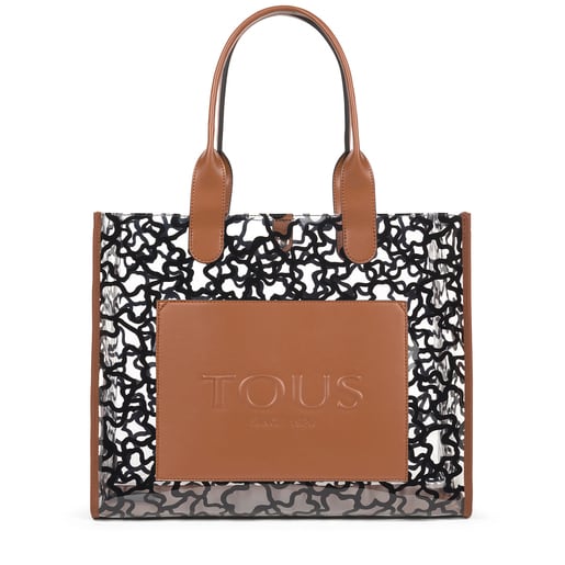 Sac shopping TOUS de la collection Amaya Vinyl grand en vinyle transparent avec imprimé oursons et des pièces en polyuréthane imitation cuir marron. Fermeture par bouton aimanté. Bandoulières longues pour les épaules. Poche extérieure plate. Dimensions : 40 x 37 x 17 cm.