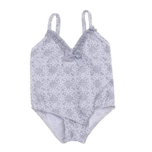 Bañador Baby TOUS de escote triángulo con fru-fru y lacito en estampado mossaico. Tirantes ajustables en la espalda. COMPOSICIÓN: 80% Poliéster Micro 20% Elastano de color Gris. Certificado OEKO/TEX*. Fabricado en la EU.