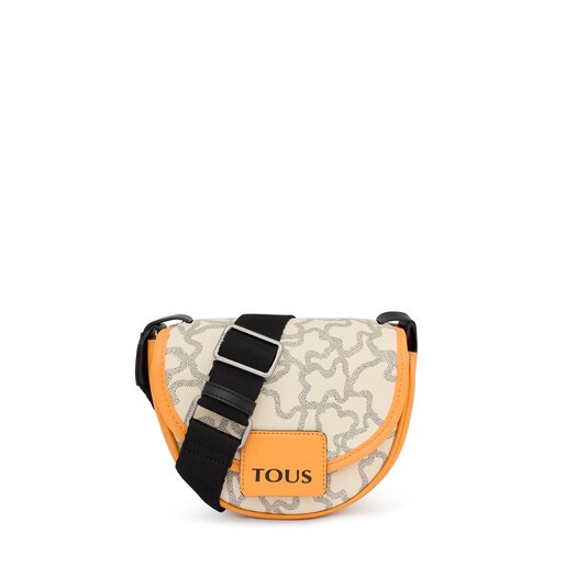 Bolso bandolera pequeño TOUS de la colección Amaya Kaos Icon en forma de media luna de lona en color beige y pulido con un vivo de piel sintética en color mostaza. Cierre de solapa con botón metálico encajable. Asa larga ajustable. Medidas (alto x ancho x fondo): 16 x 19 x 8 cm.