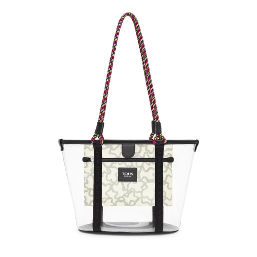 Bolso capazo mediano TOUS Kaos Summer color negro de vinilo transparente abierto con dos tiras laterales que recubren la parte externa, reforzando la estructura. Asas de hombro de nylon trenzado. En la parte interior, bolsillo de piel sintética estampada con cierre de cremallera. Medidas: (alto x ancho x fondo): 23 x 36 x 14 cm
