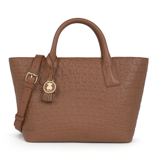 Bolso capazo TOUS de la colección Sherton en piel marrón grabada. Cierre con cremallera. Apliques personalizados. Asas de mano. Un bolsillo interior con cremallera y dos sin cremallera. Medidas: 23,5 x 39 x 14 cm.