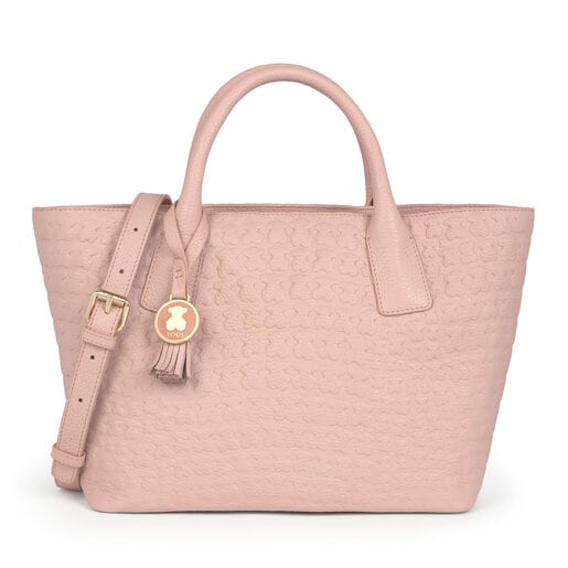 Bolso capazo TOUS de la colección Sherton en piel rosa grabada. Cierre con cremallera. Apliques personalizados. Asas de mano. Un bolsillo interior con cremallera y dos sin cremallera. Medidas: 23,5 x 39 x 14 cm.