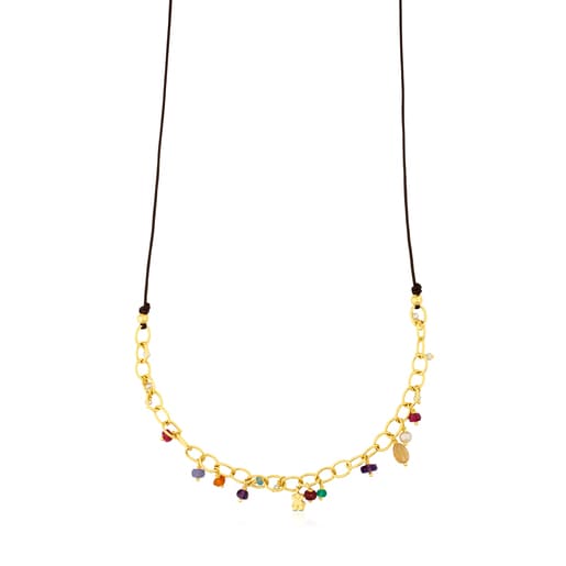 Collar TOUS Elise con baño de oro 18 kt sobre plata y cordón de nylon marrón con rubí, tanzanita, cornalina, amatista, apatito, citrino, crisoprasa y perlas. Largo: 90 cm. Plata de primera ley recubierta de oro de 18kt con un espesor de 3 a 5 micras y sin ningún otro metal entre ambos.