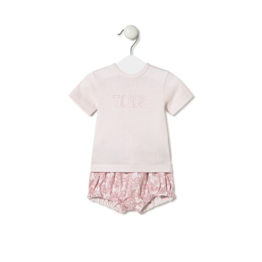 Conjunto de bebé Tous Baby 2 piezas: camiseta de manga corta, cuello redondo con logo TOUS bajo escote y pololo de corte bombacho estampado Kaos. Cinturilla y terminaciones del pololo con elástico. Composición: 100% Algodón. Color: Rosa. Fabricado en la UE. Etiquetado GREENABLE: Certificado OEKO-TEX*. Los tejidos OEKO TEX* Standard 100 certifican que se ha realizado un control en todas las etapas de fabricación: materias primas, fibras y tintes. De esta manera, aseguran no contener materiales nocivos para la salud ni para el medioambiente. Detalles: Lavar antes de usar, lavar con colores similares, no secar en secadora, lavar 30º.