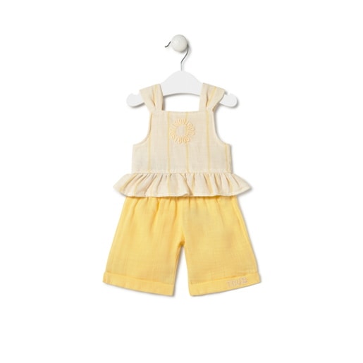 Conjunto de bebé Tous Baby de blusa y short: Blusa a rayas de tirantes de corte evasé. Short de corte casual con cinturilla elástica. Confeccionado en suave algodón a rayas combinado en piqué teñido. Logo TOUS circular estampado bajo escote. Composición: 100% Algodón. Color: Amarillo. Fabricado en la UE. Etiquetado GREENABLE: Certificado OEKO-TEX*. Los tejidos OEKO TEX* Standard 100 certifican que se ha realizado un control en todas las etapas de fabricación: materias primas, fibras y tintes. De esta manera, aseguran no contener materiales nocivos para la salud ni para el medioambiente. Detalles: Lavar antes de usar, lavar con colores similares, no secar en secadora, lavar 30º.
