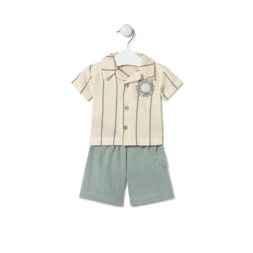 Conjunto de bebé Tous Baby de camisa y bermuda: Camisa a rayas con botones en manga corta. Bermuda de corte casual con bolsillo cuadrado lateral y cinturilla elástica. Confeccionado en suave algodón a rayas combinado en piqué teñido. Logo TOUS circular estampado en el pecho. Composición: 100% Algodón. Color: Bruma. Fabricado en la UE. Etiquetado GREENABLE: Certificado OEKO-TEX*. Los tejidos OEKO TEX* Standard 100 certifican que se ha realizado un control en todas las etapas de fabricación: materias primas, fibras y tintes. De esta manera, aseguran no contener materiales nocivos para la salud ni para el medioambiente. Detalles: Lavar antes de usar, lavar con colores similares, no secar en secadora, lavar 30º.
