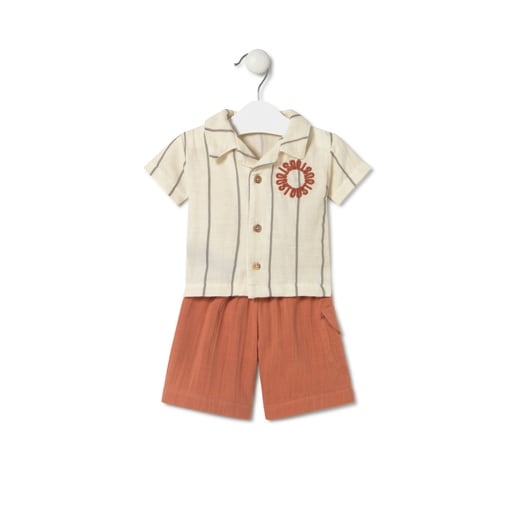 Conjunto de bebé Tous Baby de camisa y bermuda: Camisa a rayas con botones en manga corta. Bermuda de corte casual con bolsillo cuadrado lateral y cinturilla elástica. Confeccionado en suave algodón a rayas combinado en piqué teñido. Logo TOUS circular estampado en el pecho. Composición: 100% Algodón. Color: Teja. Fabricado en la UE. Etiquetado GREENABLE: Certificado OEKO-TEX*. Los tejidos OEKO TEX* Standard 100 certifican que se ha realizado un control en todas las etapas de fabricación: materias primas, fibras y tintes. De esta manera, aseguran no contener materiales nocivos para la salud ni para el medioambiente. Detalles: Lavar antes de usar, lavar con colores similares, no secar en secadora, lavar 30º.
