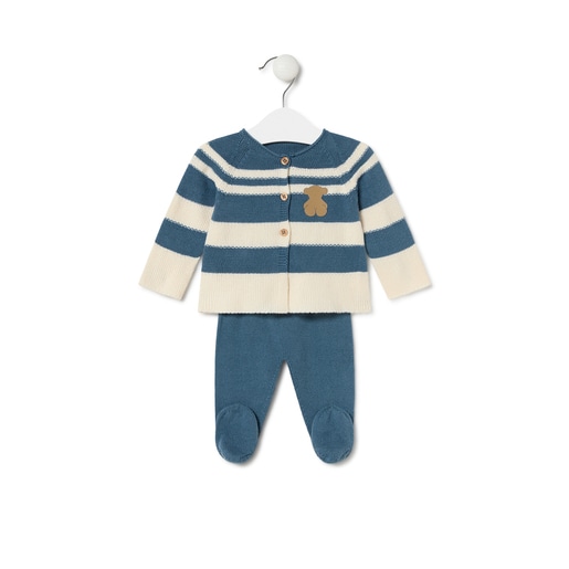 Conjunto de bebé Tous Baby 2 piezas de jersey en cuello redondo, manga larga y polaina con cinturilla acanalada. Confeccionado en punto de algodón a rayas de alta calidad sin costuras, impidiendo posibles rozaduras en las delicadas pieles de los bebés. Cierre delantero con botones de madera de olivo. Composición: 100%Algodón. Color: Azul. Fabricado en España.