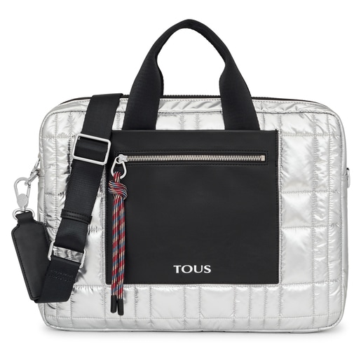 Maletín TOUS Empire Padded en color plata de nylon reciclado combinado con detalles de piel sintética. Cierre de cremallera. Un bolsillo frontal abierto y otro con cremallera. Bolsillo interior abierto. Cinta trasera para poder sujetar el maletín a una maleta trolley. Asas fijas de mano y asa bandolera ajustable y extraíble. Medidas (alto x ancho x fondo): 27 x 38 x 7 cm.