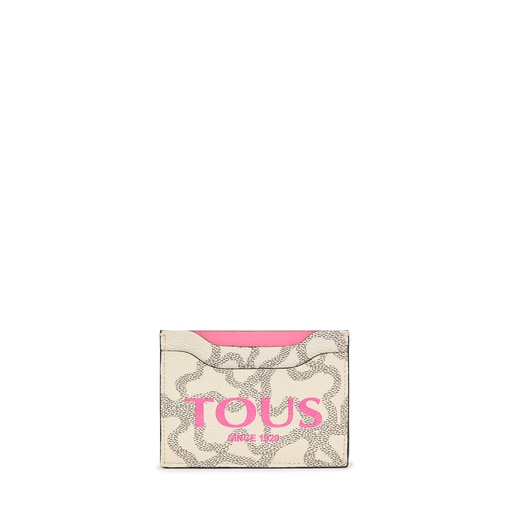 Tarjetero TOUS Kaos Legacy de lona con estampado Kaos en color beige. También incorpora detalles en piel vacuna de color rosa. Cuenta con 3 ranuras exteriores para tarjetas y un compartimento para monedas con cierre de botón a presión. Medidas (alto x ancho x fondo): 7,5 x 10 x 2 cm.