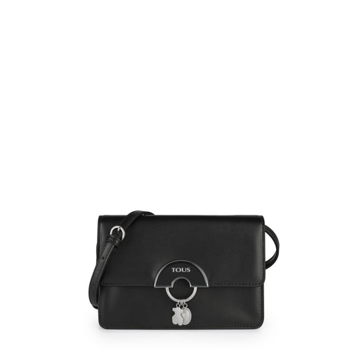 Bolso bandolera pequeña TOUS Hold de vinilo en color negro. Asa bandolera ajustable. Cierre con solapa y botón imantado. Lleva una anilla de metal en color plata con dos motivos, nuestro oso y una piedra simulada en línea con joyería. Medidas: 13x20x6 cm. Nota: Este modelo también puede llevarse como riñonera.