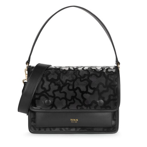 Bolso TOUS Bandolera mediana de la colección Audree de vinilo efecto piel en negro y vinilo transparente con estampado Tous en color negro. Bolso cuenta con asa del hombo y asa larga ajustable y extraíble. Dentro hay 2 compartimentos y un bolsillo interior con cremallera y otro plano, exterior. Cierre con boton magnetico. Medidas: 25,5 x 18,5 x 11 cm