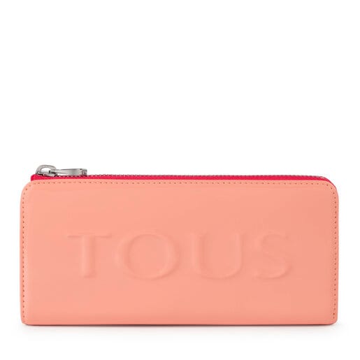 Billetera mediana TOUS colección Dorp de vinilo efecto piel con acabado charol con relieve TOUS en color rosa. Cierre con cremallera. Compartimento central con cremallera, ocho compartimentos para tarjetas y dos bolsillos planos. Medidas: 10x19x3 cm.