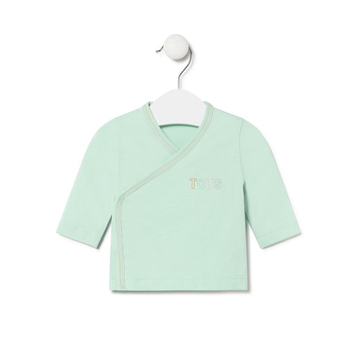 Camiseta de bebé Tous Baby cruzada de recién nacido en manga larga. Confeccionada en suave algodón liso con logo TOUS bordado multicolor. Terminaciones pespunteadas en contraste de color. Composición: 100% Algodón. Color: Bruma. Certificado OEKO/TEX*. Fabricado en la UE.