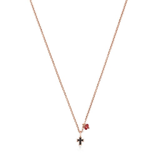 Collar TOUS Motif cruz con baño de oro rosa 18 kt sobre plata con espinelas y rubí. Tamaño de la cruz: 0,58 cm. Largo: 45 cm. Plata de primera ley recubierta de oro de 18kt con un espesor de 3 a 5 micras y sin ningún otro metal entre ambos.