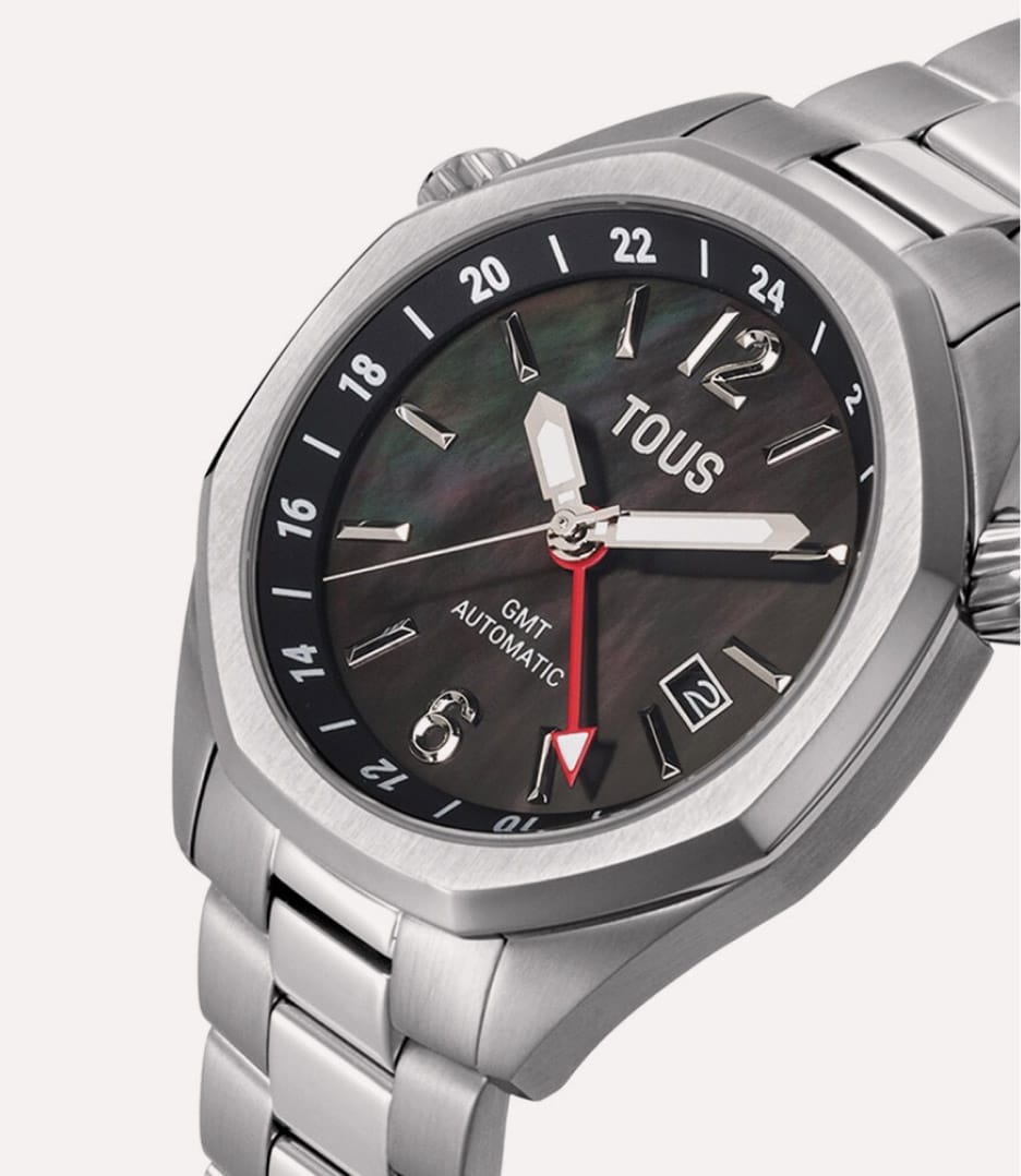 Reloj gmt automático con esfera de nácar gris y brazalete de eslabones de acero Tous Now