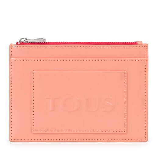 Neceser plano TOUS de la colección Dorp de vinilo efecto charol con relieve TOUS en color rosa. Cierre con cremallera. Cuatro compartimentos para tarjetas y seis compartimentos planos. Medidas: 15,5 x 11 x 1cm.