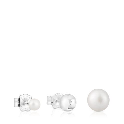 Pack de tres aretes TOUS Tsuri de plata de primera ley con perlas cultivadas. Uno con perla cultivada de 7-7,5 mm, otro con perla cultivada de 3-3,5 mm y otro con bola en plata de primera ley de 6 mm y grabado oso de 3 mm. Cierre presión.