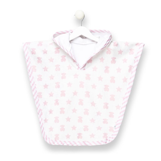 Poncho de playa Baby TOUS con capucha, en tejido de rizo blanco con ribete rallado y motivos estampados en rosa. Ofrece calidez, confort y gran absorción en el secado. COMPOSICIÓN: 70% Algodón, 30% Poliéster. MED.: T-S 18M-2A, T-M 2A-3A, T-L 3A-4A. Certificado OEKO/TEX*. Fabricado en la UE.