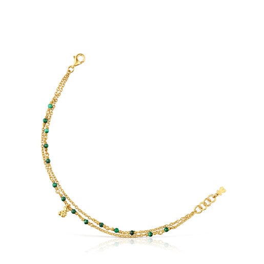Pulsera TOUS Bold Bear con baño de oro 18 kt sobre plata y malaquita formada por dos cadenas unidas en los extremos, una de ellas con motivo oso colgante con baño de oro 18 kt sobre plata. Tamaño gemas: 2-2,5 mm. Tamaño oso: 5,35 mm. Longitud pulsera: 17,5 cm. Cierre mosquetón.
