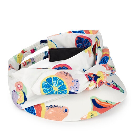 Visera Tous Summer Multi de tela en color blanco con estampado multicolor de frutas. Talla unica, ajustable con goma en la parte trasera.