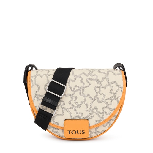 Bolso bandolera mediano TOUS de la colección Amaya Kaos Icon en forma de media luna de lona en color beige y pulido con un vivo de piel sintética en color mostaza. Cierre de solapa con botón metálico encajable. Bolsillo interior con cierre de cremallera y detalle bordado con logo. Asa larga ajustable. Medidas (alto x ancho x fondo): 19 x 25 x 9 cm.