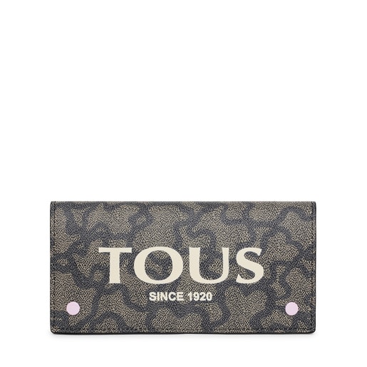 Billetera Flat mediana TOUS Kaos Legacy de lona con estampado Kaos en color negro. También incorpora detalles en piel vacuna de color malva. El cierre es con dos botones a presión. En el interior cuenta con 2 compartimentos abiertos, 1 con cremallera y 6 ranuras para tarjetas. Medidas (alto x ancho x fondo): 10 x 20 x 2 cm.