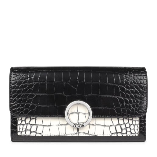 Billetera mediana TOUS de la colección Audree de vinilo efecto piel de crocodrilo en color blanco y negro. Cierre con botón a presión. Interior: bolsillo con cremallera, ocho departamentos para tarjetas y tres departamentos grandes para varios. Lleva una anilla de metal en color dorado. Medidas: 11 x19,5x 3,5 cm.
