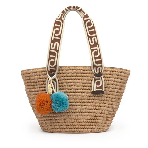 Bolso tipo capazo grande de la colección TOUS Summer de rafia natural. Asas de hombro de jacquard en color marrón. La parte interior cuenta con un saco de lona con cierre ajustable de cordón y un bolsillo pequeño con cremallera. Detalle: incluye un colgante decorativo con dos pompones (azul y naranja). Medidas: 32 x 29 x 14 cm.