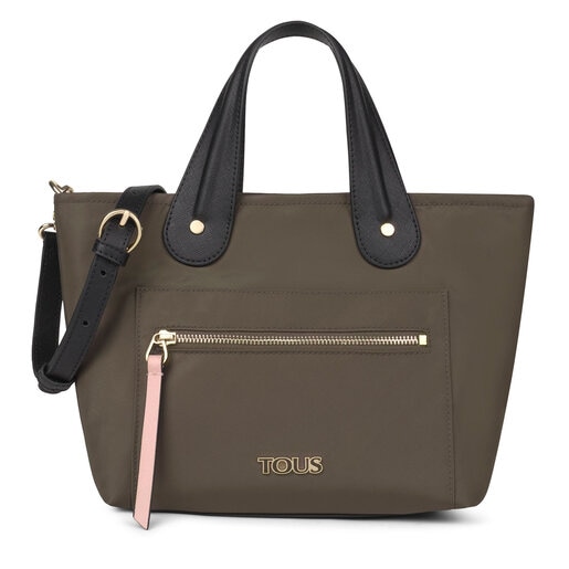 Bolsa capazo pequeño Tous de la colección Shelby de vinilo con efecto piel combinado con nylon reciclado en color caqui. Cierre con cremallera. Asa de bandolera ajustable, extraíble y dos asas de mano. Bolsa cuenta con 1 bolsillo exterior con cremallera, 1 bolsillo exterior plano y 2 bolsillos interiores: 1 plano y 1 con cremallera. Medidas: 34 x 20 x 15cm.