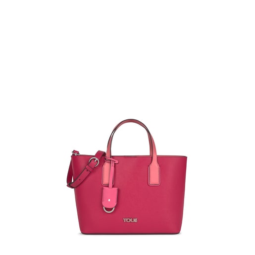 Bolsa capazo pequeño Tous de la colección Essential de vinilo efecto safiano combinado con vinilo efecto piel en color multi rosa. Bolsa cuenta con un compartimento grande. Cierre con bóton magnetico. Asa de bandolera ajustable y extraíble y asas de mano. Colgante decorativo está incluido. Medidas: 37 x 23,5 x 14cm.