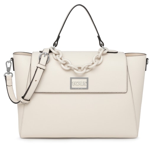 Bolso city grande TOUS Funny de piel sintética con textura saffiano en color beige. Incorpora una solapa y el cierre es con dos botones magnéticos. Cuenta con un bolsillo interior abierto. Viene con asa de mano y asa de bandolera ajustable y extraíble. Incluye una bonita cadena decorativa. Medidas (alto x ancho x fondo): 24 x 41 x 11 cm.