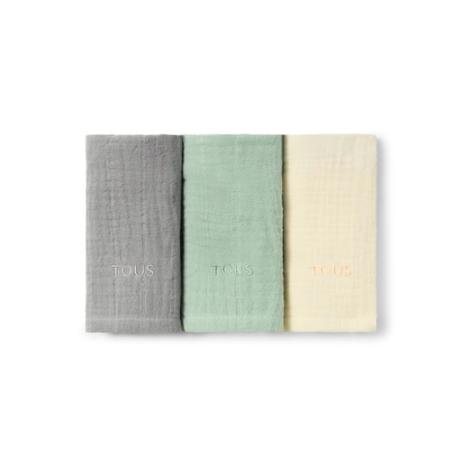 Pack de 3 mini gasas Tous Baby de suave tejido liso absorbente, transpirable y anti alergénica. Ideal como babero, salva eruptos y otros usos. Composición: 100% Algodón. Color: Gris. Medidas: 38x38cm. Certificado OEKO/TEX*. Fabricado en la UE.