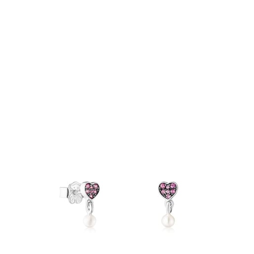 Pendientes TOUS New Motif de plata de primera ley con motivo corazón de zafiros rosa y detalle de perla. Cierre presión. Tamaño corazón: 4,4mm x 4,6mm.