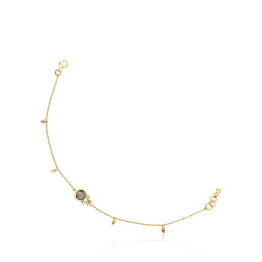 Pulsera Virtual Garden de oro de 18kt con labradorita 6 mm, zafiro naranja 3 mm y dos topacios azules de 1,5 mm. Detalles gemas colgantes: rodolita, cromodiópsido, amatista y topacio azul. Tamaño detalles gemas: 1,5 mm. Cierre mosquetón. Longitud de la pulsera: 17,5 cm.