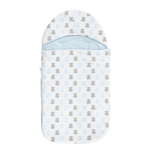 Saco Baby TOUS para cuco en suave algodón blanco con ositos estampados en gris y azul celeste. Interior de color azul celeste liso. Universal, adaptable a cualquier modelo del grupo 0. COMPOSICIÓN: 100% Algodón, Relleno: 100% Poliéster. MED.: 39x78cm. Certificado OEKO/TEX*. Fabricado en la UE.