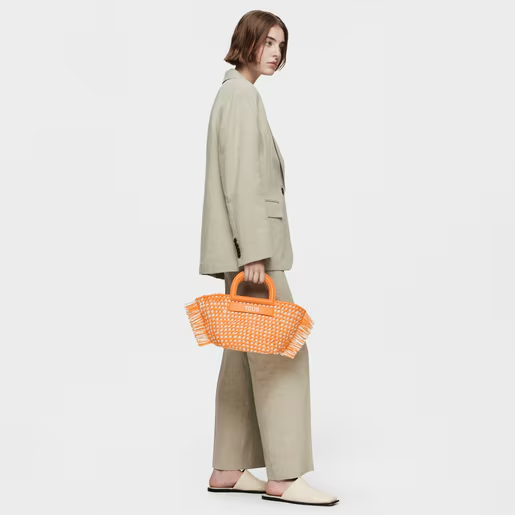 Para un look veraniego perfecto, combina el capazo de rafia con vestidos ligeros de algodón o lino en tonos blancos o neutros. Añade unas sandalias de cuero y gafas de sol grandes para un estilo bohemio y chic. Los accesorios en tonos dorados resaltarán el color naranja del bolso, aportando un toque de sofisticación.