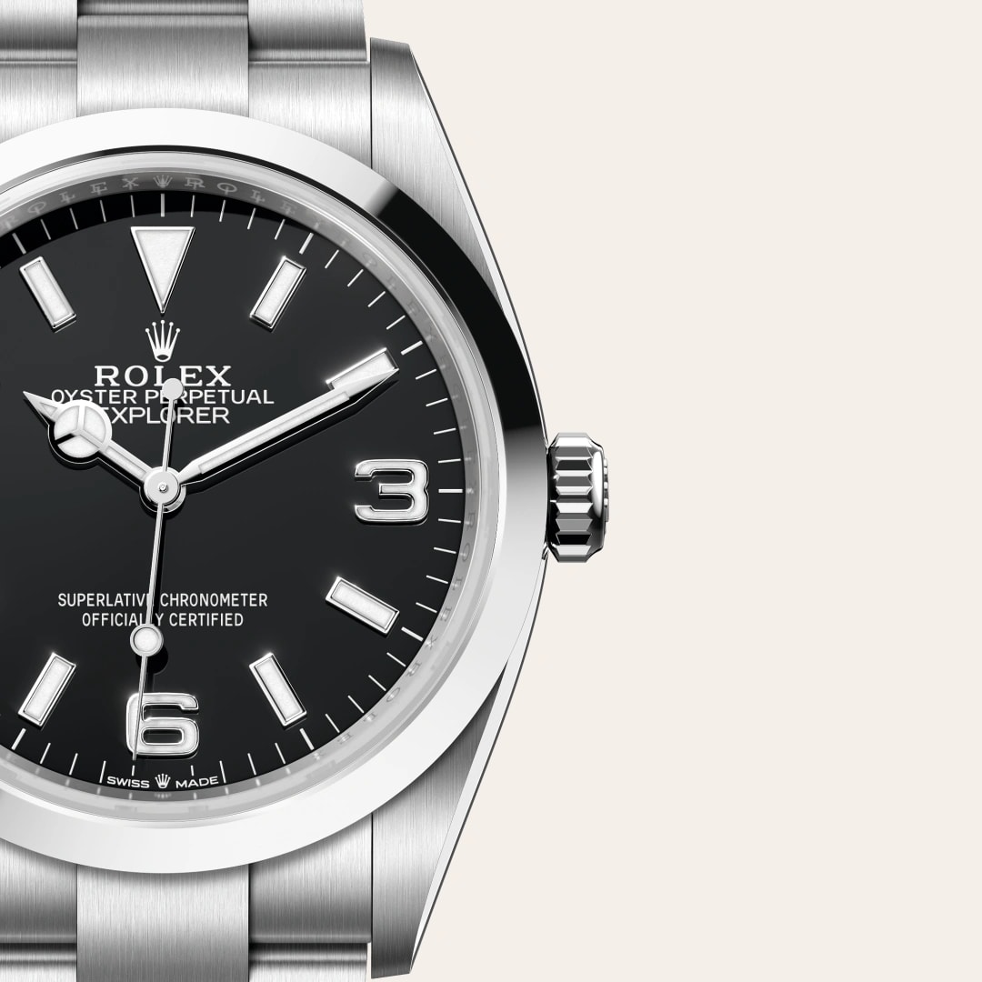 La esfera es el rostro distintivo de un reloj Rolex, el mayor responsable de su identidad y legibilidad. Los números 3, 6 y 9, característicos del modelo Explorer, están rellenos de un material luminiscente, que emite un color azul de larga duración, igual que los índices y las agujas. Como todos los relojes Rolex, la esfera del Explorer 36 está diseñada y manufacturada en nuestros talleres, principalmente a mano, para garantizar su perfección.