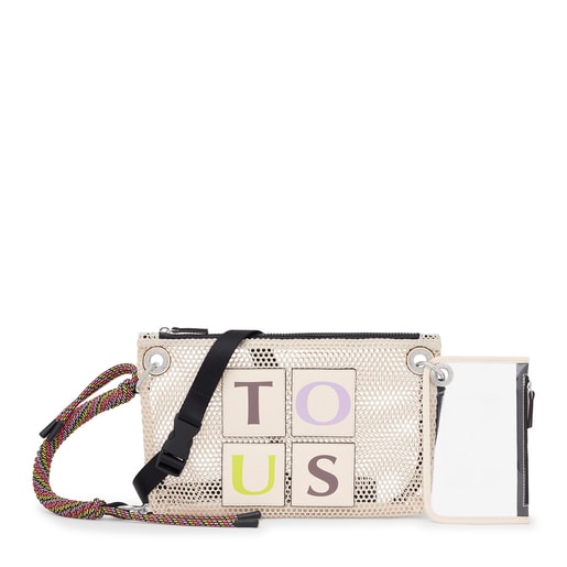 TOUS Net crossbody bag in beige with recycled polyester mesh. It also features synthetic leather trim. Fastens with a zipper. It has a detachable handle and an adjustable and detachable crossbody strap. It comes with a small transparent toiletry bag with zipper fastening and an open interior pocket for cards. Measurements (height x width x depth): 20 x 33 x 2 cm.
