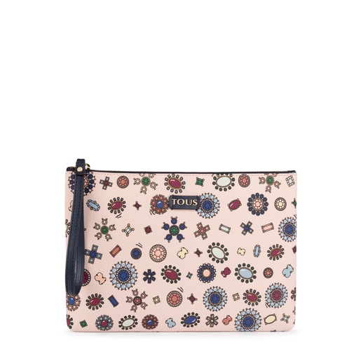 TOUS clutch bag from the Teatime collection in pink printed polyurethane. The bag has a short carry handle and a flat interior pocket. Zip closure. Measurements: 2.5 x 27 x 19 cm.
