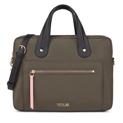 TOUS briefcase from the Shelby collection in leather-effect vinyl combined with khaki recycled nylon. Fastens with zipper, handles and adjustable and detachable crossbody strap. The briefcase has 1 exterior pocket with zipper, 1 flat exterior pocket and 2 interior pockets: 1 flat and 1 with zipper. Measurements: 34 x 27 x 7 cm.