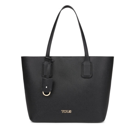 TOUS Essential collection large tote bag in Saffiano-effect vinyl combined with leather-effect vinyl in black. The bag features a large compartment. Magnetic button closure. Shoulder straps. Decorative pendant included. Measurements: 40 x 29 x 15 cm.