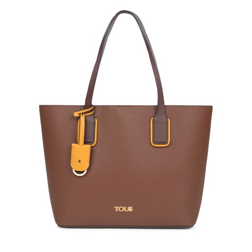 TOUS Essential collection large tote bag in Saffiano-effect vinyl combined with leather-effect vinyl in brown and mustard. The bag features a large compartment. Magnetic button closure. Shoulder straps. Decorative pendant included. Measurements: 40 x 29 x 15 cm.