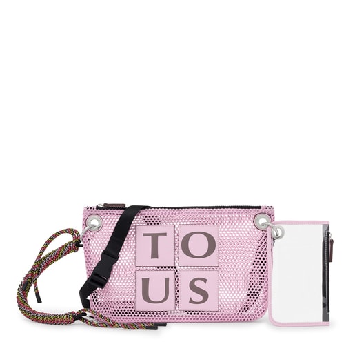 TOUS Net crossbody bag in mauve with recycled polyester mesh. It also features synthetic leather trim. Fastens with a zipper. It has a detachable handle and an adjustable and detachable crossbody strap. It comes with a small transparent toiletry bag with zipper fastening and an open interior pocket for cards. Measurements (height x width x depth): 20 x 33 x 2 cm.